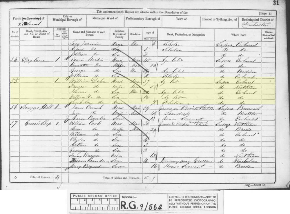 1861 England, Wales & Scotland census, Dag Lane, Ewhurst, Sussex, RG9/564, Folio 31, Page 11, Schedule 55, head of household: William Duke, National Archives.