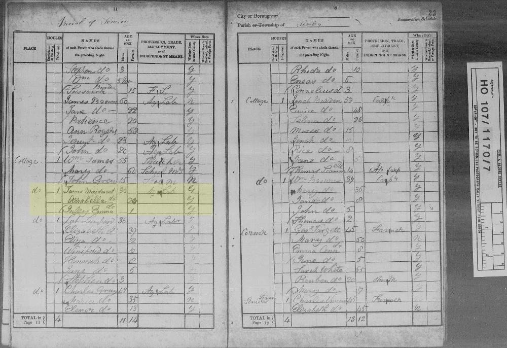The household consisted of James, his wife Arrabella and their daughter Juley Emma (age 1)