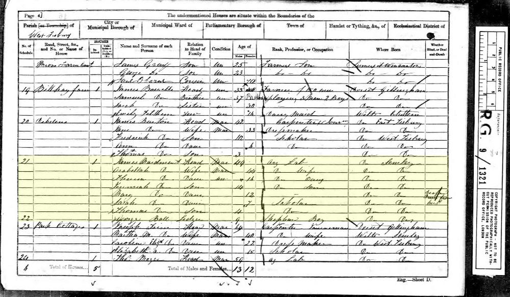 The household consisted of James, his wife Arabella, their children Thirza (age 16), Jeremiah (age 14), Mary (age 12), Sarah (age 7) and Thomas (age 4), and a lodger George Ball (age 9) who was a shepherd's boy. Mary is shown as being deaf and dumb from birth. The address covered two cottages which were associated with Billhay Farm where James Bowells farmed 150 acres employing 3 men and 2 boys. James was probably one of the men and George Ball one of the boys.