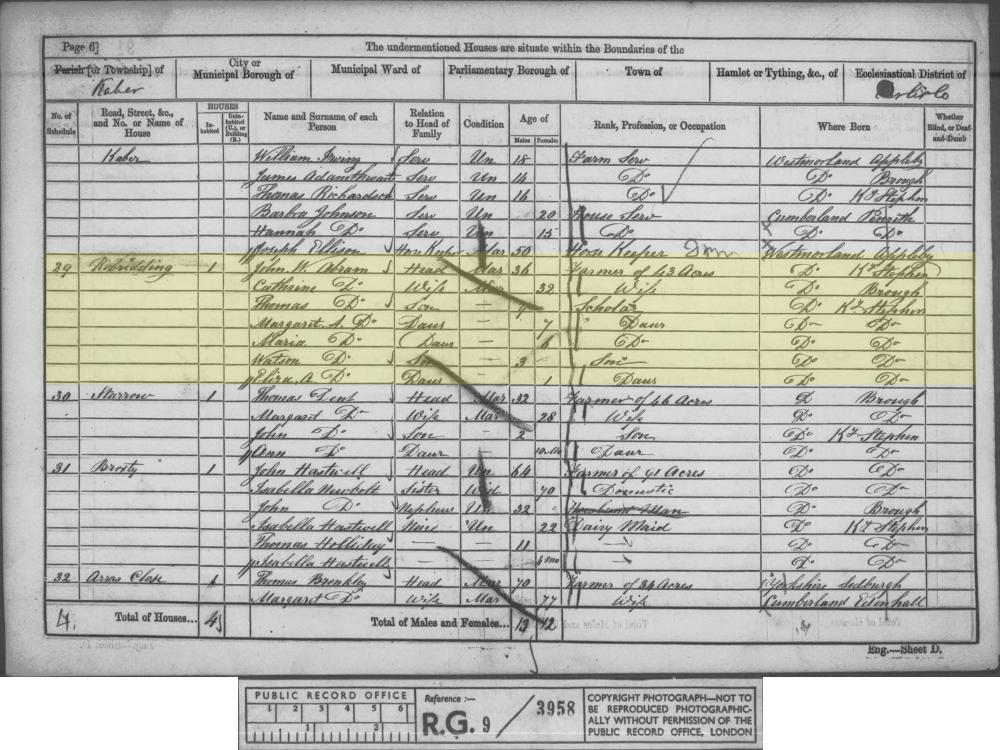 1861 England, Wales & Scotland census, Robridding, Kaber, Westmoreland, head of household: John W Abram, National Archives.
