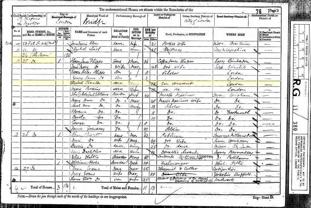 1881 England, Wales & Scotland census, 25 Fish Street Hill (The Swan), St Michael Crooked Lane, London, RG11/380, Folio 76, Page 3, Schedule 12, head of household: Henry James Phipps, National Archives.