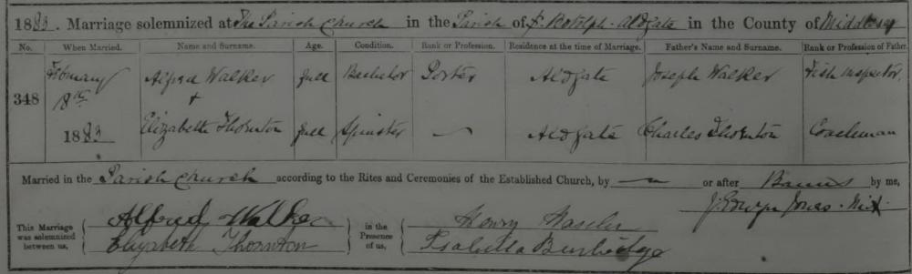 Parish Register for Marriage of Alfred Walker and Elizabeth Thornton, St Boltolph, Aldgate, Middlesex, 18 February 1883, London Metropolitan Archives.
