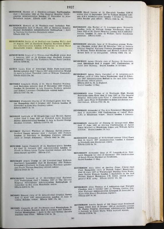 Grant of Probate: Bertie Hamsworth, 4 November 1957, Principal Probate Registry, 361.