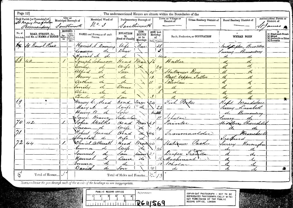 1881 England, Wales & Scotland census, 40 Rouel Road, Bermondsey, head of household: Joseph Johnson, National Archives.