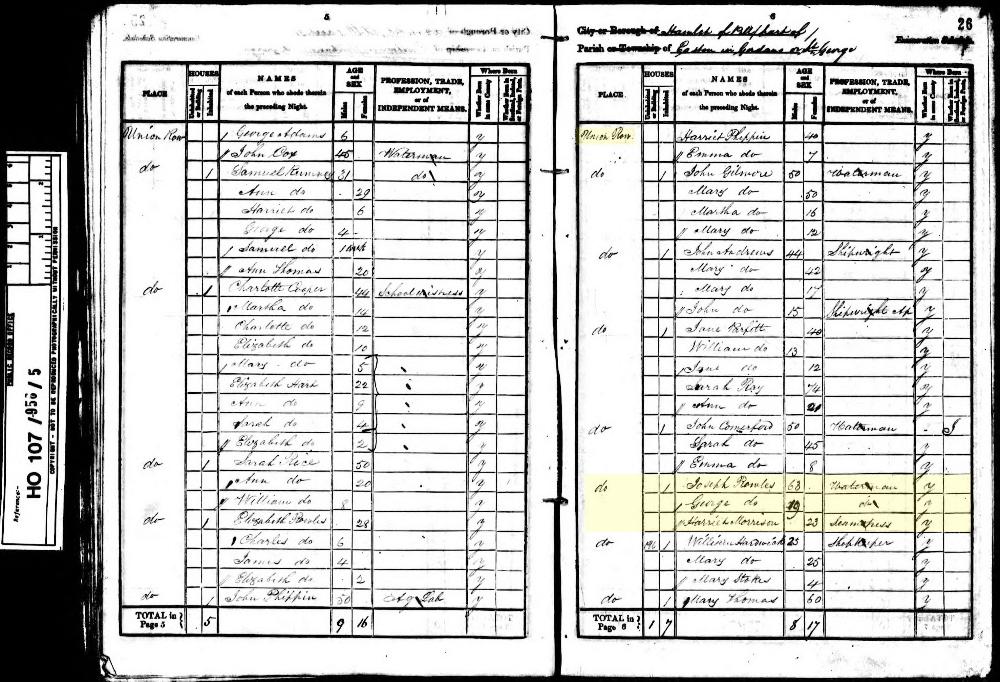 The household consisted of Joseph, his wife Rachel, his unmarried daughter Harriet, and grandsons Thomas (age 7) and John (age 3). It is thought that Thomas and John were Harriet's children born out of wedlock.