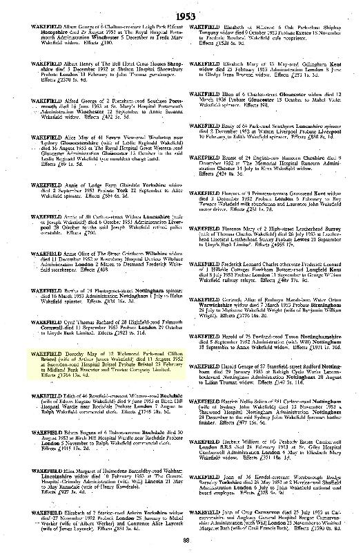 Grant of Probate: Dorothy May Wakefield, 25 February 1953, Principal Probate Registry, Volume W Page 88.