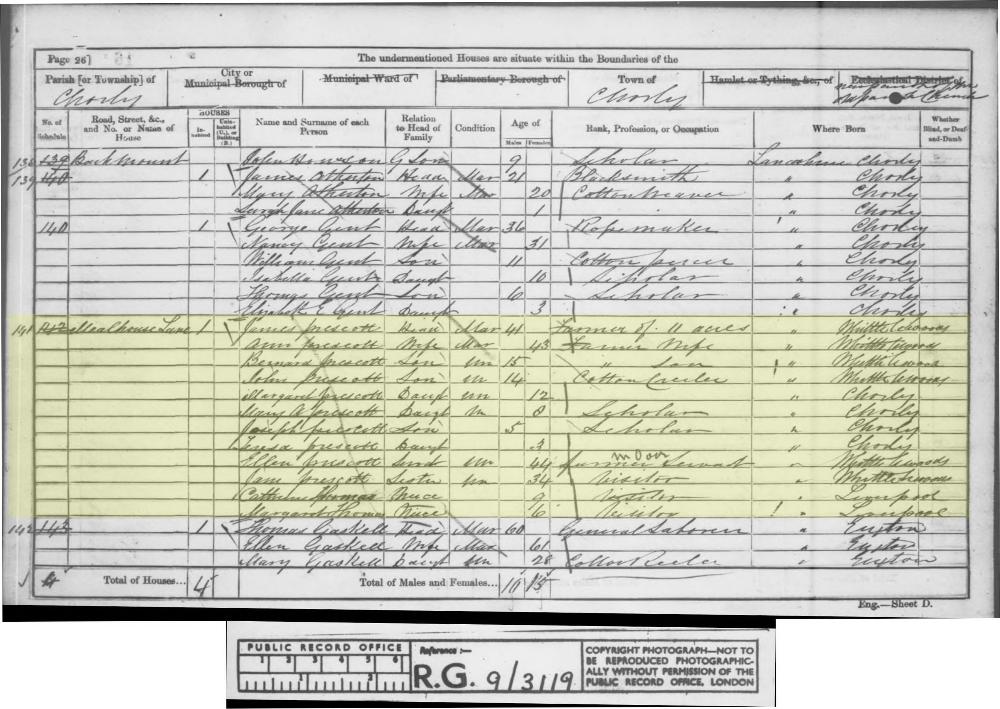 1861 England, Wales & Scotland census, Mealhouse Lane, Chorley, Lancashire, RG9/3119, Folio 16, Page 26, Schedule 141, head of household: James Prescott, National Archives.