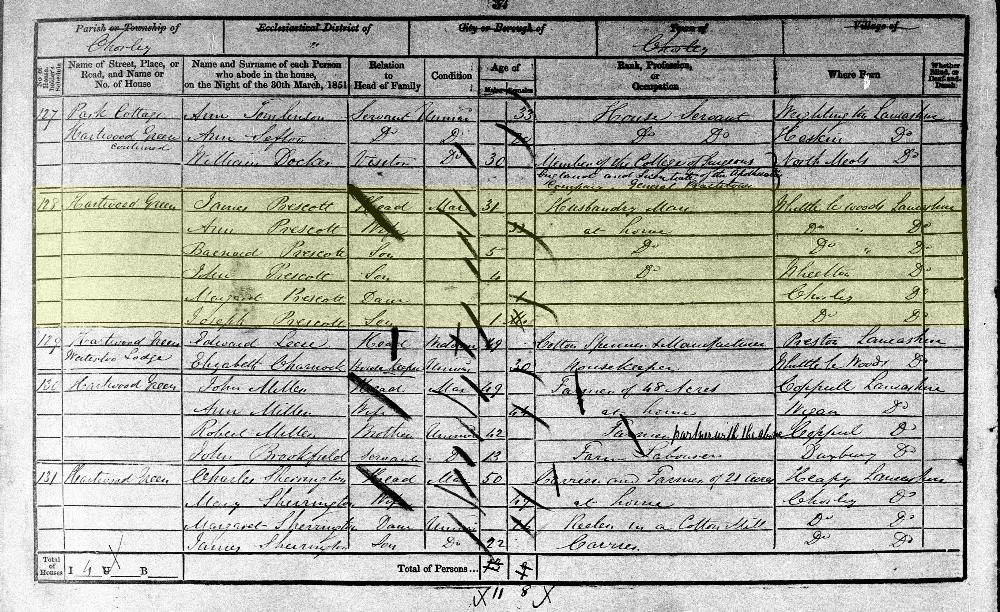 1851 England, Wales & Scotland census, Hartwood Green, Chorley, Lancashire, head of household: James Prescott, National Archives.