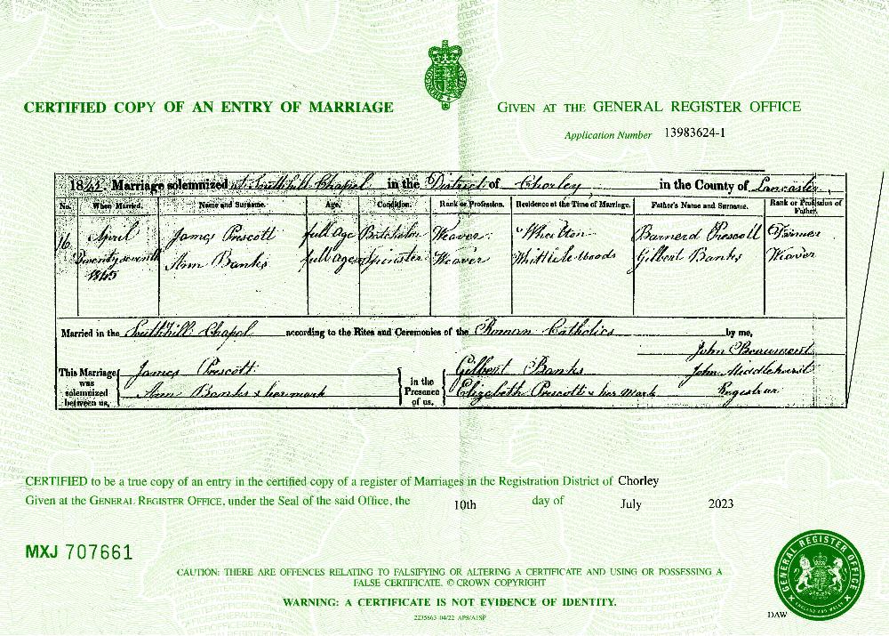 Marriage certificate of James Prescott and Ann Banks, 27 April 1845, Pat Ward.