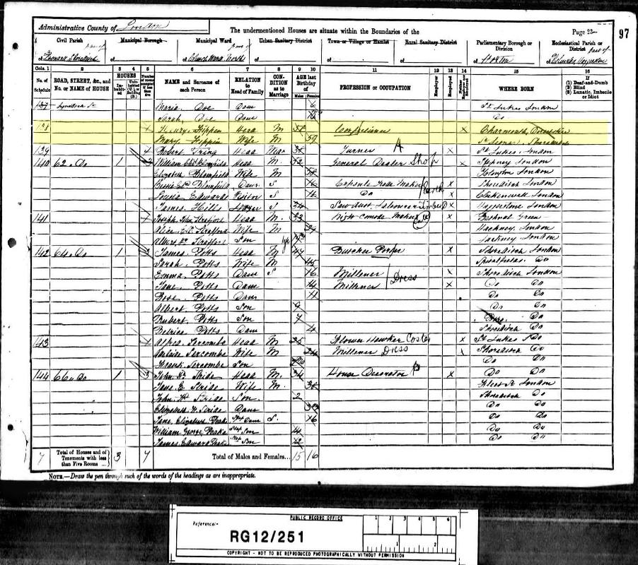 1891 England Census for Household of Henry Fippen in St Leonard, Shoreditch, (Ancestry - 1891 England Census RG number/Piece: RG12/251 Folio: 97 Page: 251). Cit. Date: 5 April 1891. National Archives.