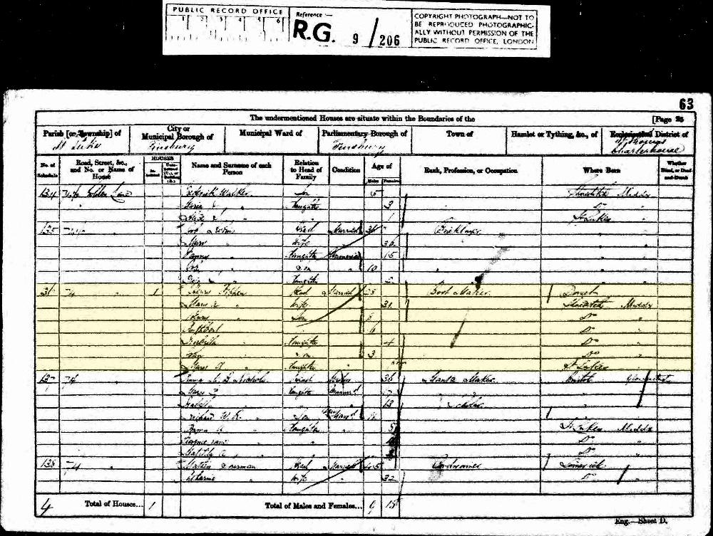 The household consisted of Henry and his wife Mary. They were living in a single room sharing the 4 roomed house with another family of four living in 2 rooms and a widower who also had a single room. Similar houses in the street were accommodating up to 11 people.