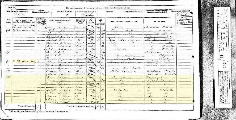 1871 England, Wales & Scotland census, 20 Blue Anchor Alley, St Luke, Finsbury, Middlesex, RG10/411, Folio 25, Page 20, Schedule 100, head of household: Henry Fippen, National Archives.