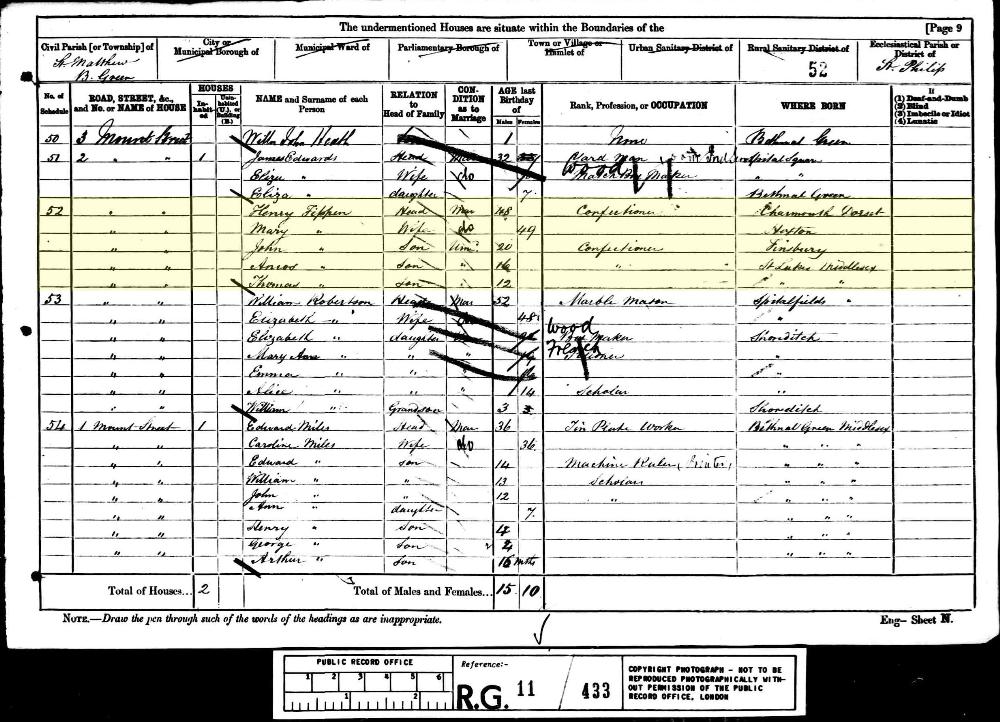 1881 England Census for Household of Henry Fippen in Bethnal Green, (Ancestry website). Custom Id: RG11/433, Folio 52, Page 9, Schedule 52; National Archives.
