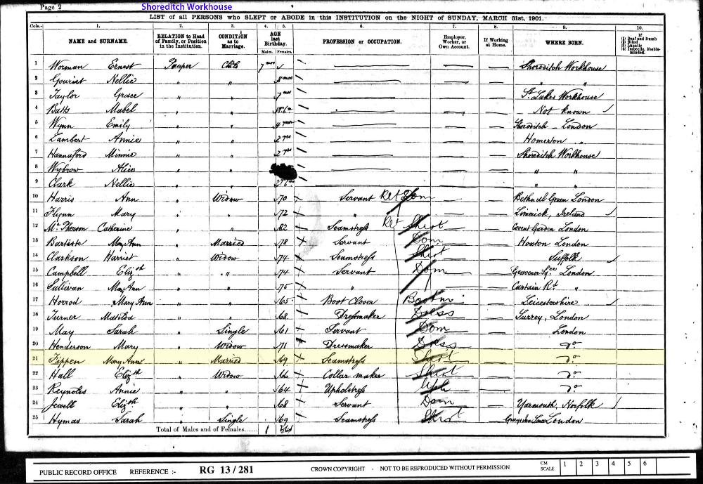 1901 Census for Mary Ann Fippen in Shoreditch Workhouse, (Ancestry website). Custom Id: RG13/281, Folio 175. Page 2, Line 21; Cit. Date: 31 March 1901. National Archives.