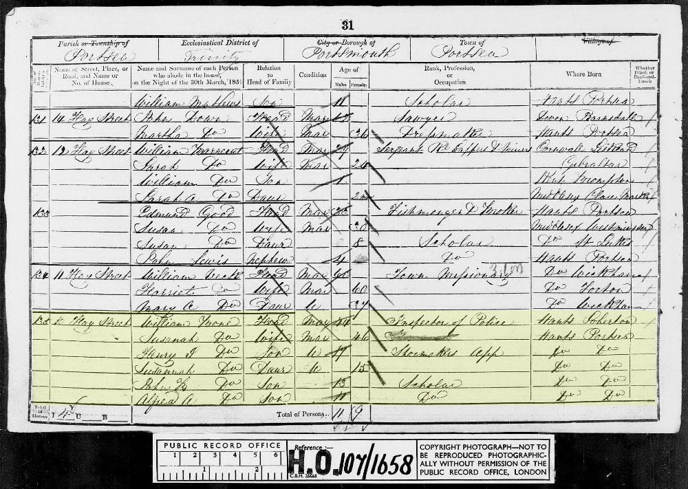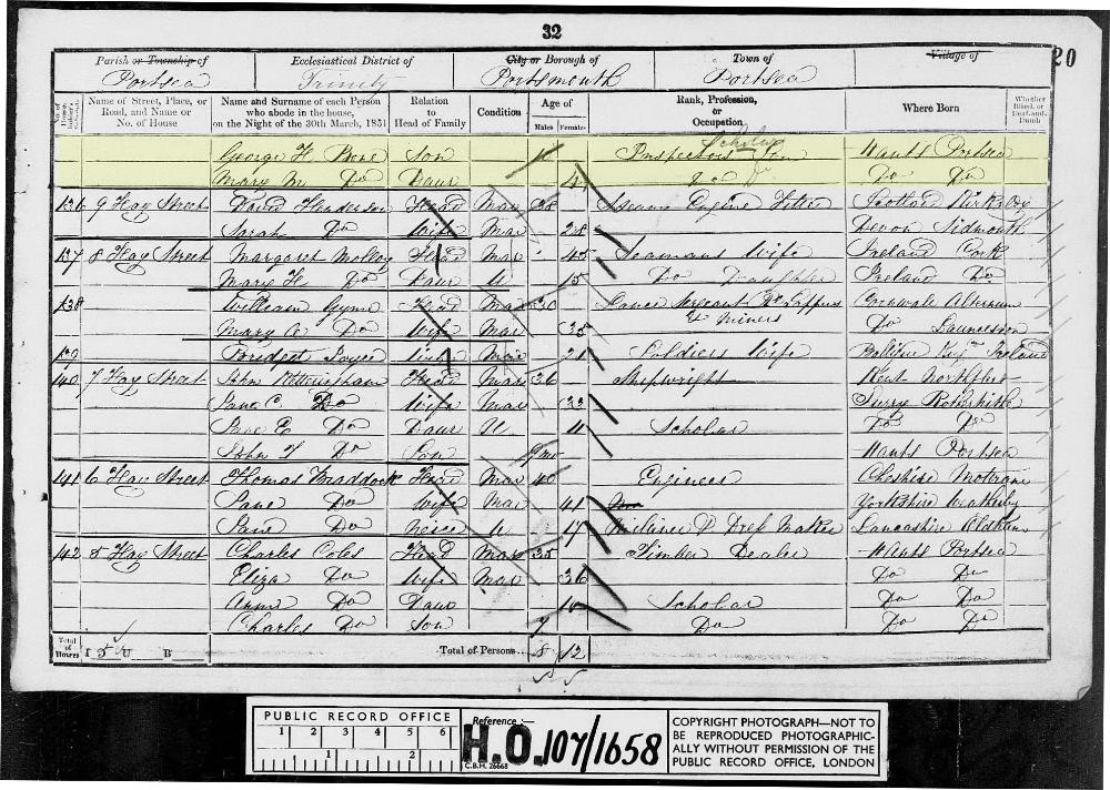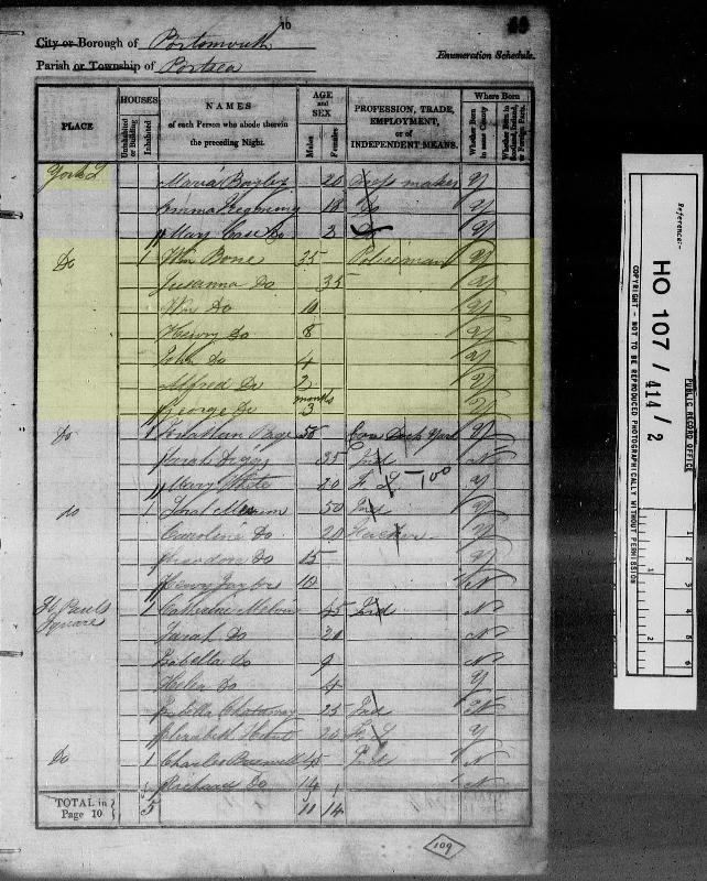 1851 England, Wales & Scotland census, 10 Hay Street, Portsea, Hampshire, HO107/1658, Folio 19, Page 31, Schedule 135, head of household: William Bone, National Archives.