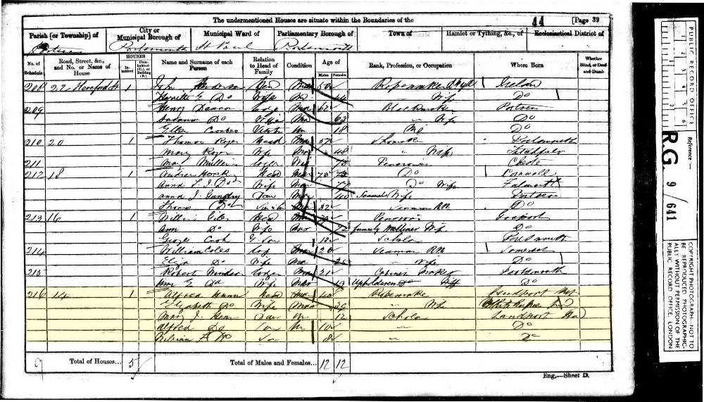 1861 England, Wales & Scotland census, 14 Hereford Street, Portsea, Hampshire, head of household: Alfred Hunn, National Archives.