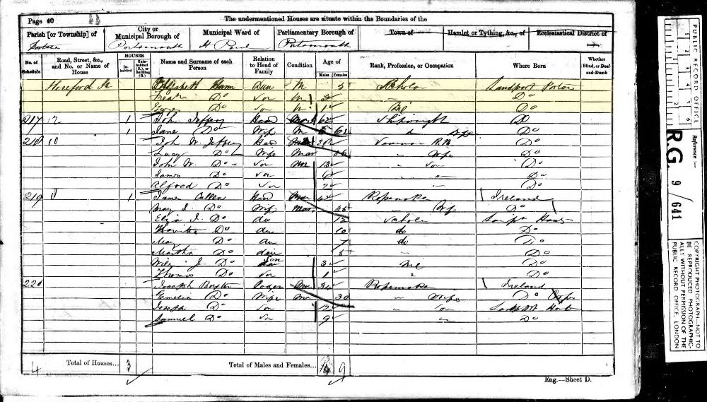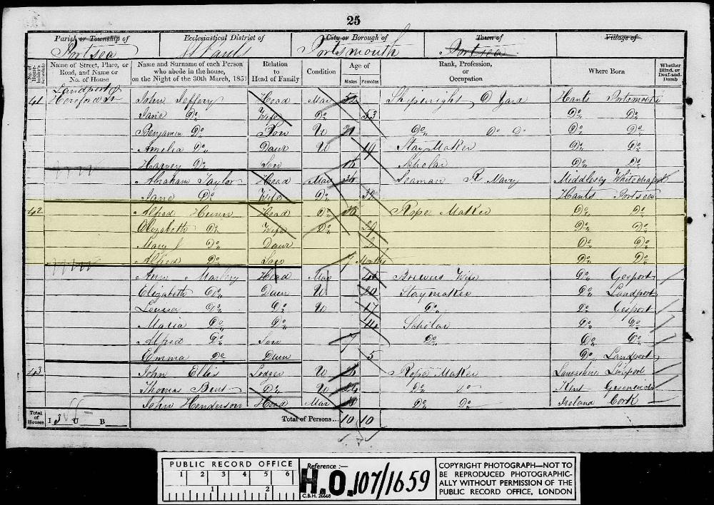 1851 England, Wales & Scotland census, Hereford Street, Portsea, Hampshire, head of household: Alfred Hunn, National Archives.