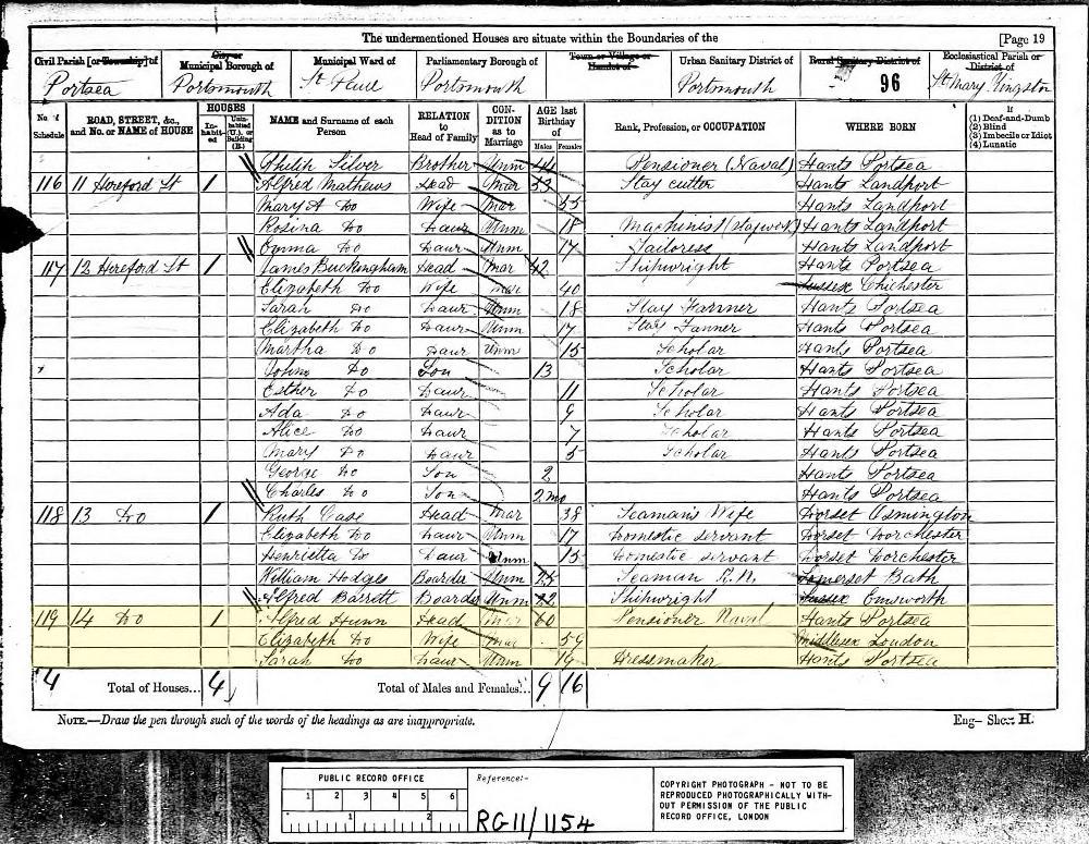 1881 England, Wales & Scotland census, 14 Hereford Street, Portsea, Hampshire, RG11/1154, Folio 96, Page 19, Schedule 119, head of household: Alfred Hunn, National Archives.