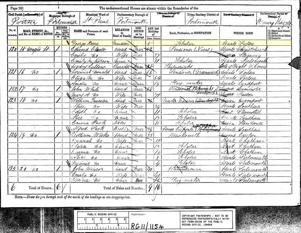 The household consisted of Alfred who is shown as a Naval pensioner, his wife Elizabeth, their daughter Sarah (age 19) and their grandson George Bone (age 5).