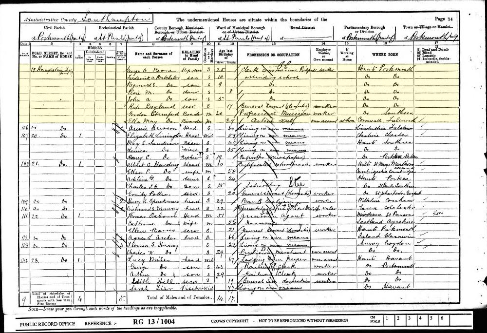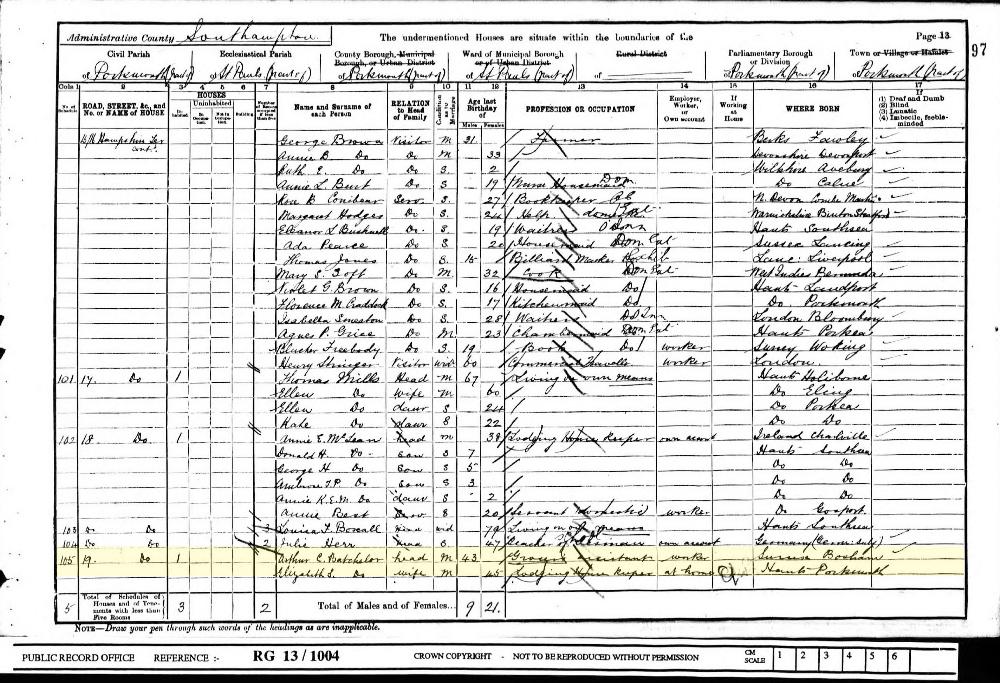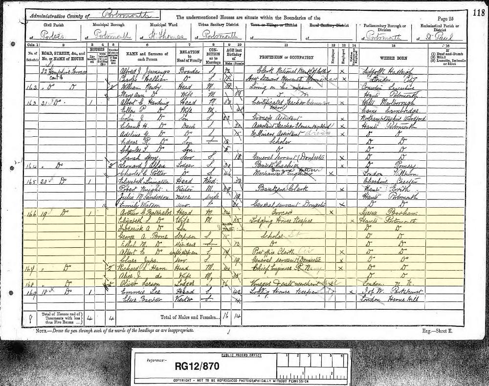 1891 England, Wales & Scotland census, 19 Hampshire Terrace, Portsea, Hampshire, head of household: Arthur C Batchelor, National Archives.