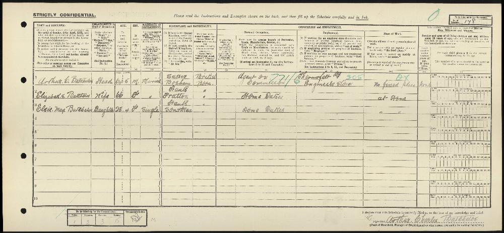 The household consisted of Arthur, his wife Elizabeth who is still taking in lodgers, Elizabeth's son by her previous marriage to Alfred Bone - George (age 25), and Arthur's and Elizabeth's children Frederick (age 10), Reginald (age 9), Alice (age 8) and John (age 5). They also had a servant Boyland and two boarders.