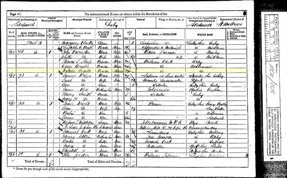 1871 England, Wales & Scotland census, 70 High Street, Derby, Derbyshire, RG10/3572, Folio 42, Page 36, Schedule 260, head of household: John Carrington, National Archives.
