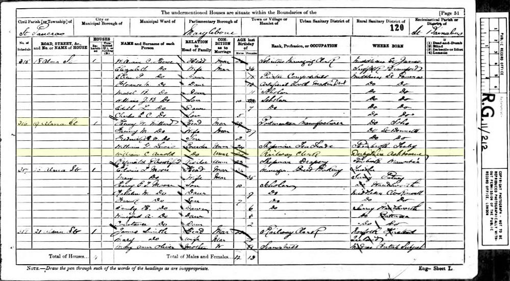 The household consisted of John Carrington, his wife Phillis and three boarders - all railway clerks - Thomas Sharp, William's brother George and William himself.