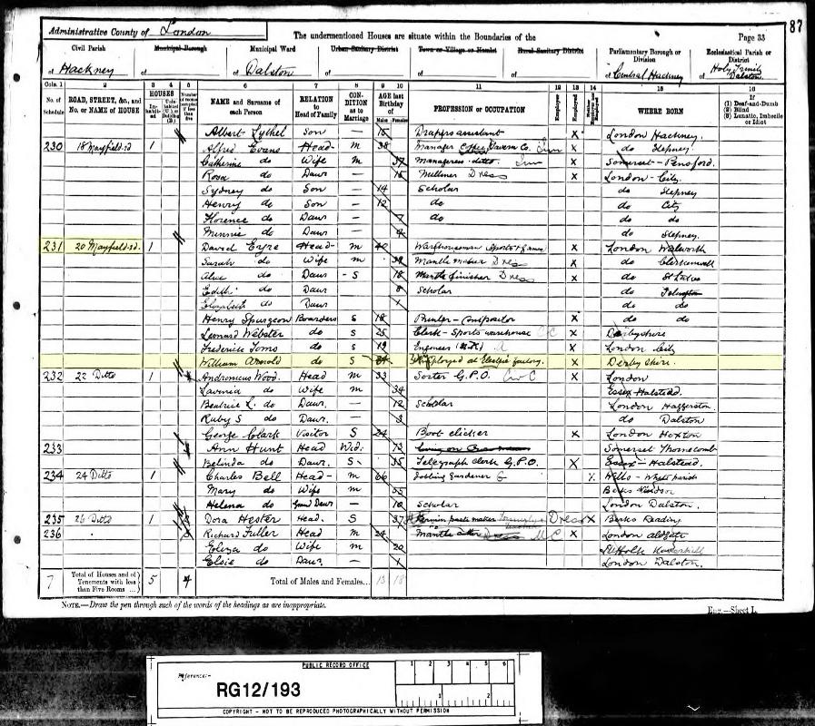 1891 England, Wales & Scotland census, 20 Mayfield Road, Hackney, London, head of household: David Eyre, London Metropolitan Archives.