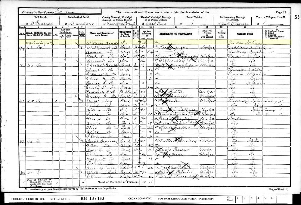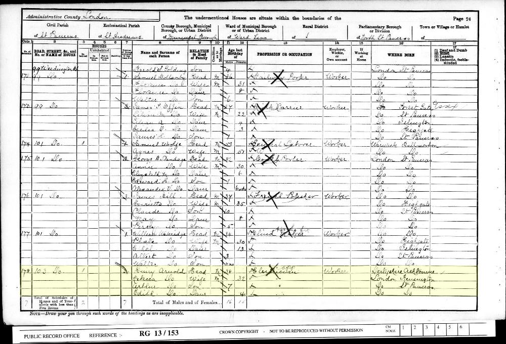 1901 England, Wales & Scotland census, 103 Weedington Road, Kentish Town, Middlesex, RG13/153, Folio 54, Page 24, Schedule 178, head of household: Henry Arnold, National Archives.