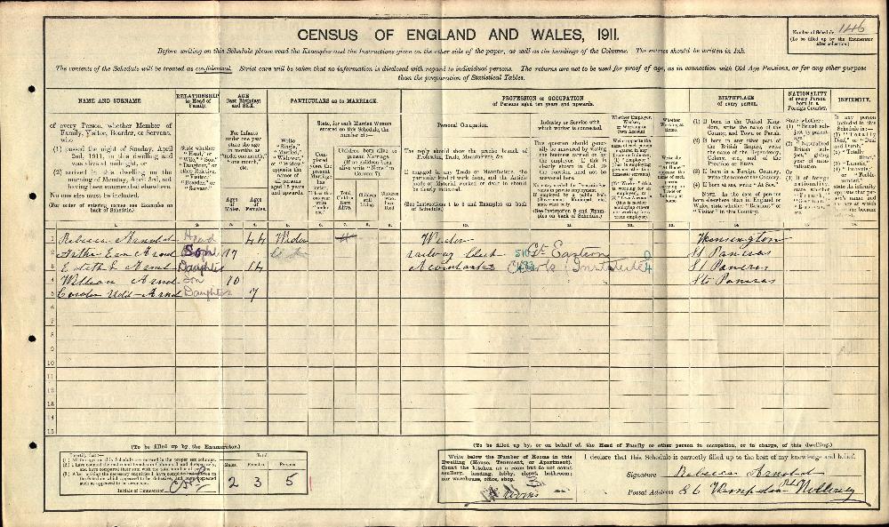 1911 England, Wales & Scotland census, 86 Hampden Road, Upper Holloway, Islington, London, head of household: Rebecca Arnold, National Archives.