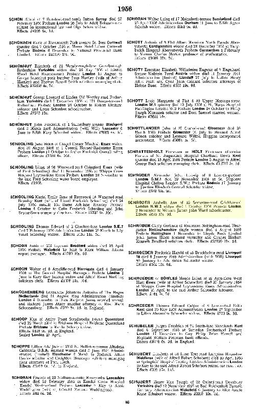 Grant of Probate: Arabella Ann Schroder, 2 November 1956, Principal Probate Registry, Volume W, Page 85.
