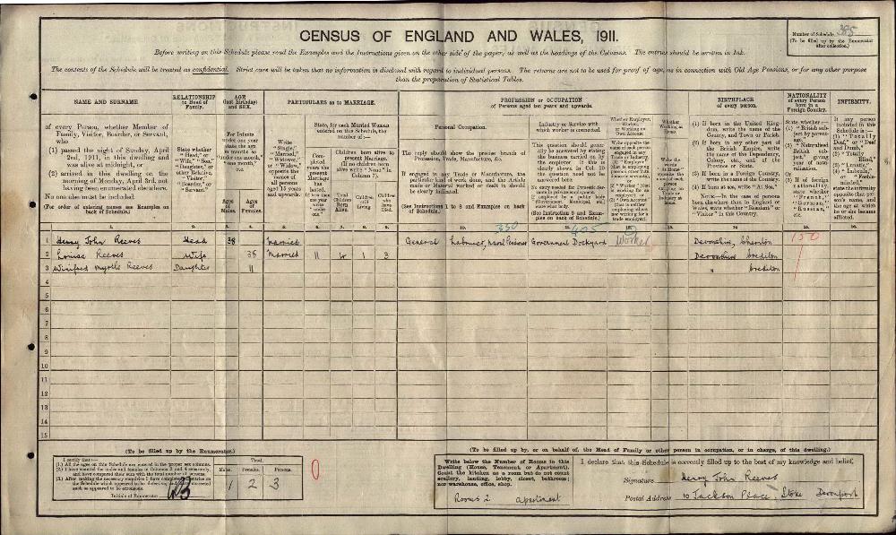 1911 England, Wales & Scotland census, 10 Jackson Place, Devonport, Devon, head of household: Henry John Reeves, National Archives.
