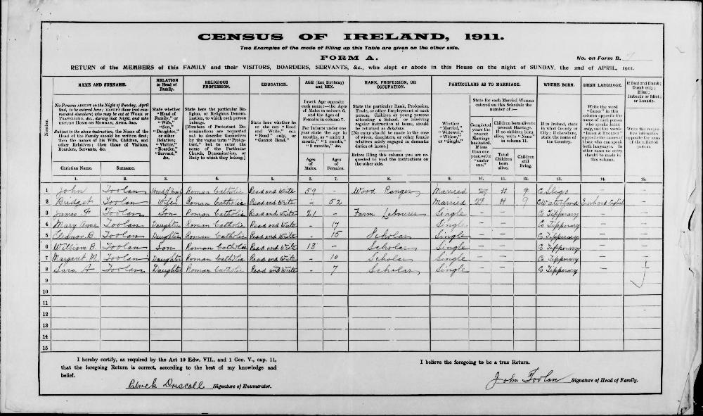 1911 Ireland census, house 7 in Mountanglesby, Clogheen, County Tipperary, Ireland, head of household: John Toolan, National Archives of Ireland.