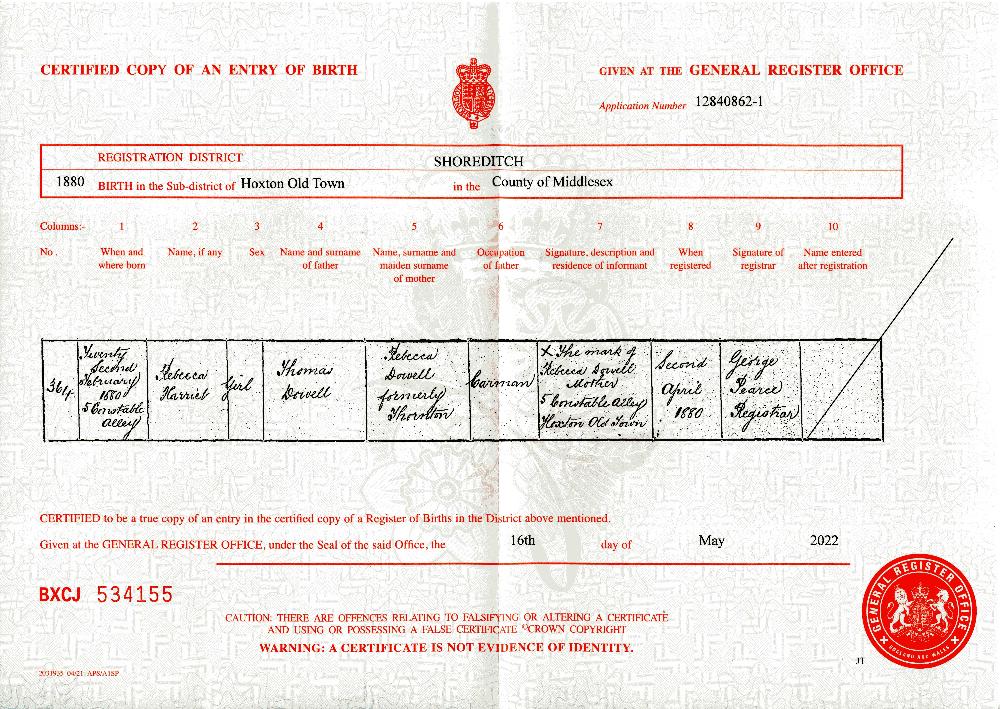 General Register Office, CRI(E&W) for Birth of Rebecca Harriet Dowell, (FreeBMD website). Custom Id: Births 1880 Q2 for Shoreditch Vol. 1c, Page 92; Cit. Date: Q2 1880. General Register Office. Call Number: Births.