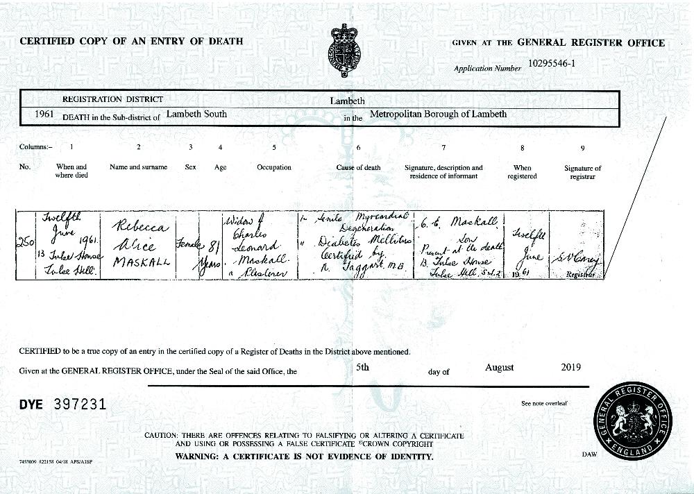 General Register Office, Civil Registration Index (England & Wales) for Death of Rebecca A. Maskall, (Ancestry website). Custom Id: Deaths 1961 Q2 Lambeth Vol. 5c, Page 1174; Cit. Date: Q2 1961. General Register Office. Call Number: Deaths.