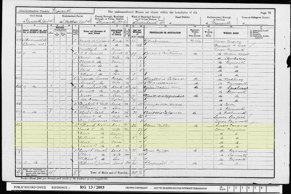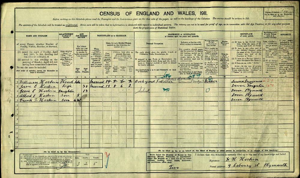1911 England, Wales & Scotland census, 9 Cobury Street, Plymouth, Devon, RG14/13002, Schedule 300, head of household: William Hoskin, National Archives.