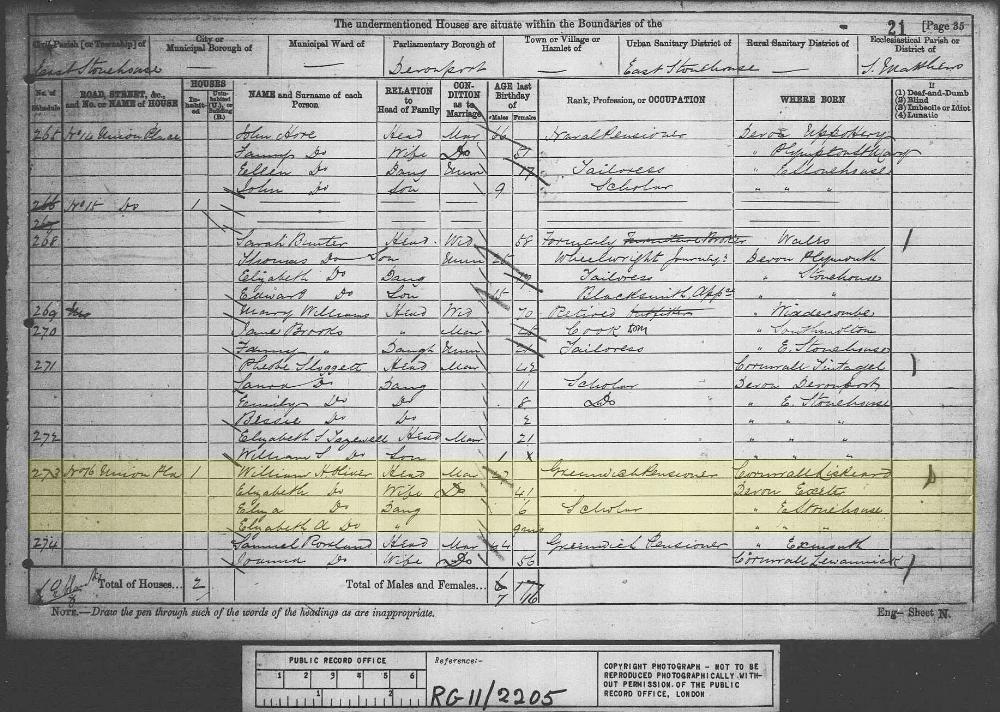 1881 England, Wales & Scotland census, 16 Union Place, East Stonehouse, Devon, head of household: William H Oliver, National Archives.