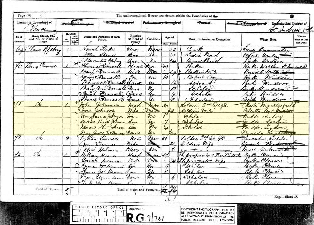 1861 England, Wales & Scotland census, Elms Corner, Clewer, Windsor, Berkshire, RG9/761, Folio 85, Page 14, Schedule 71, head of household: John Johnson, National Archives.