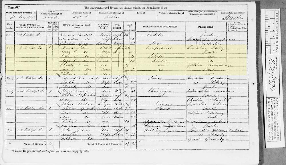 1871 England and Wales census, 4 St Botolph Terrace, Lincoln, Lincolnshire, RG10/3370, Folio 22, Page 38, Schedule 207, head of household: Thomas Lee, National Archives.