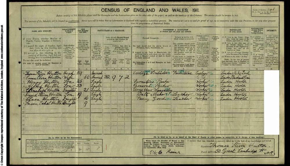 1911 England Census for Household of Thomas Steven Hutton in Shoreditch, London, (FMP website). Custom Id: RG14/1372, Schedule 148; Emma Eliza Hutton wife of Thomas Steven Hutton married 32 years. National Archives. Call Number: RG14/1372.