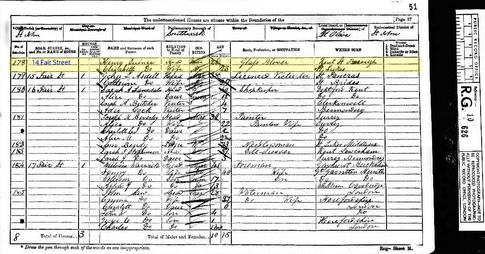 1871 England Census for Household of Henry Quince in St John, Bemonsey, Middlesex, (FindMyPast website). Custom Id: RG10/626, Folio: 51, Pages 26 & 27, Schedule 178; Name and occupation. Cit. Date: 2 April 1871. National Archives. Call Number: RG10/626.