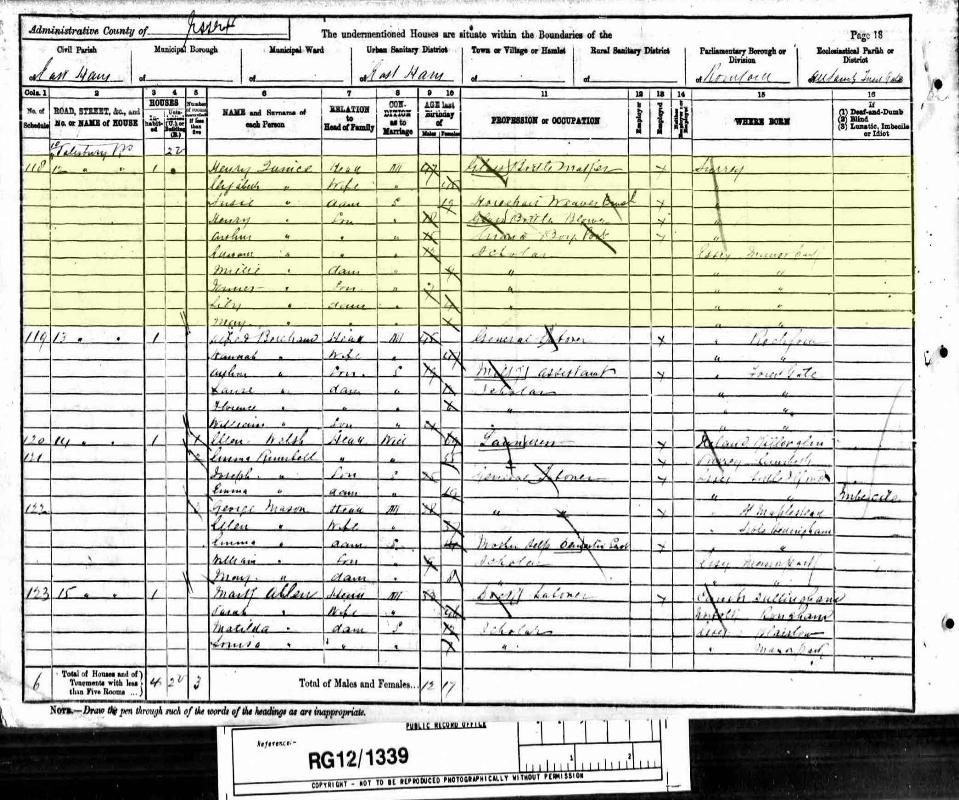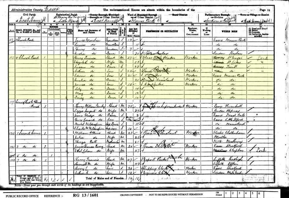 1901 England Census for Household of Henry Quince in East Ham, Essex, (Ancestry website). Custom Id: RG13/161, Folio 13, Page 18, Schedule 118; Cit. Date: 31 March 1901. National Archives. Call Number: RG13/1601.