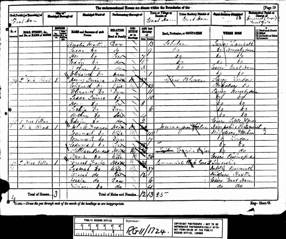 1881 England Census for Household of Henry Quince in East Ham, Essex , (Ancestry website). Name and occupation. Cit. Date: 3 April 1881. National Archives. Call Number: RG11/1724.