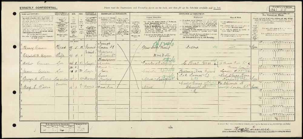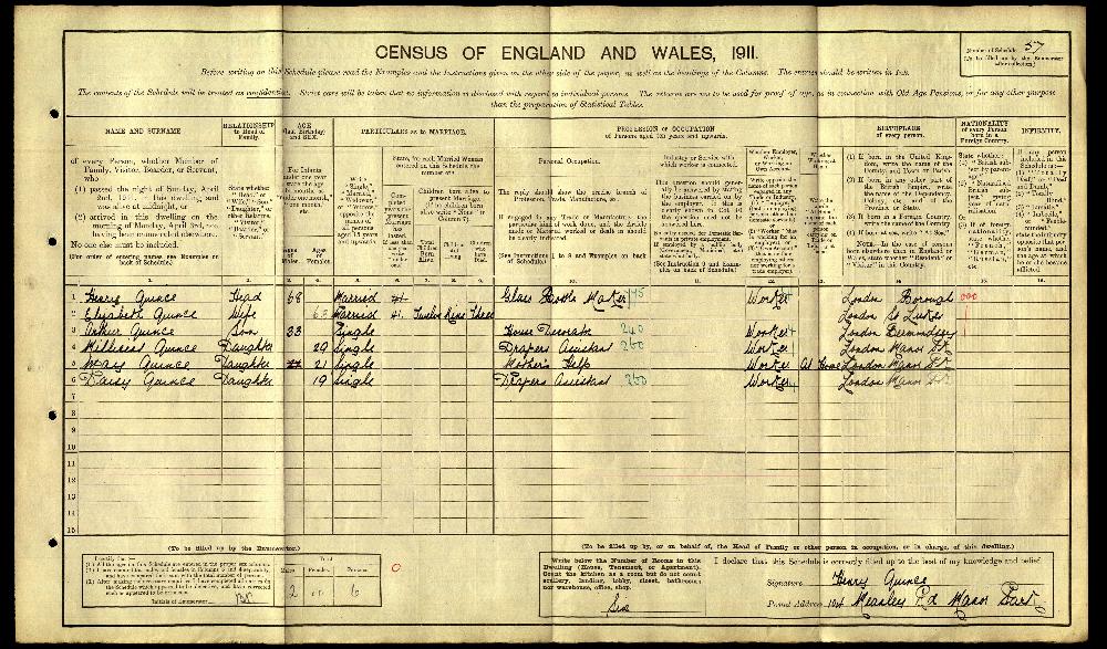 1911 England, Wales & Scotland census, 104 Meanley Road, Manor Park, London, head of household: Henry Quince, National Archives.