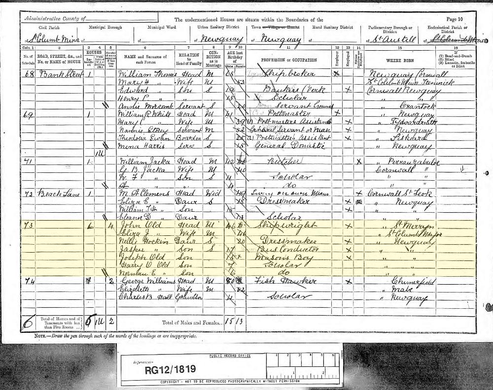 1891 England, Wales & Scotland census, Beech Lane, Newquay, Cornwall, head of household: John Old, National Archives.