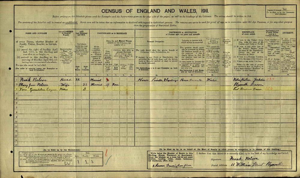 1911 England, Wales & Scotland census, 11 William Street, Plymouth, Devon, RG14/13001, Schedule 261, head of household: Vera Gwendoline Rogers, National Archives.