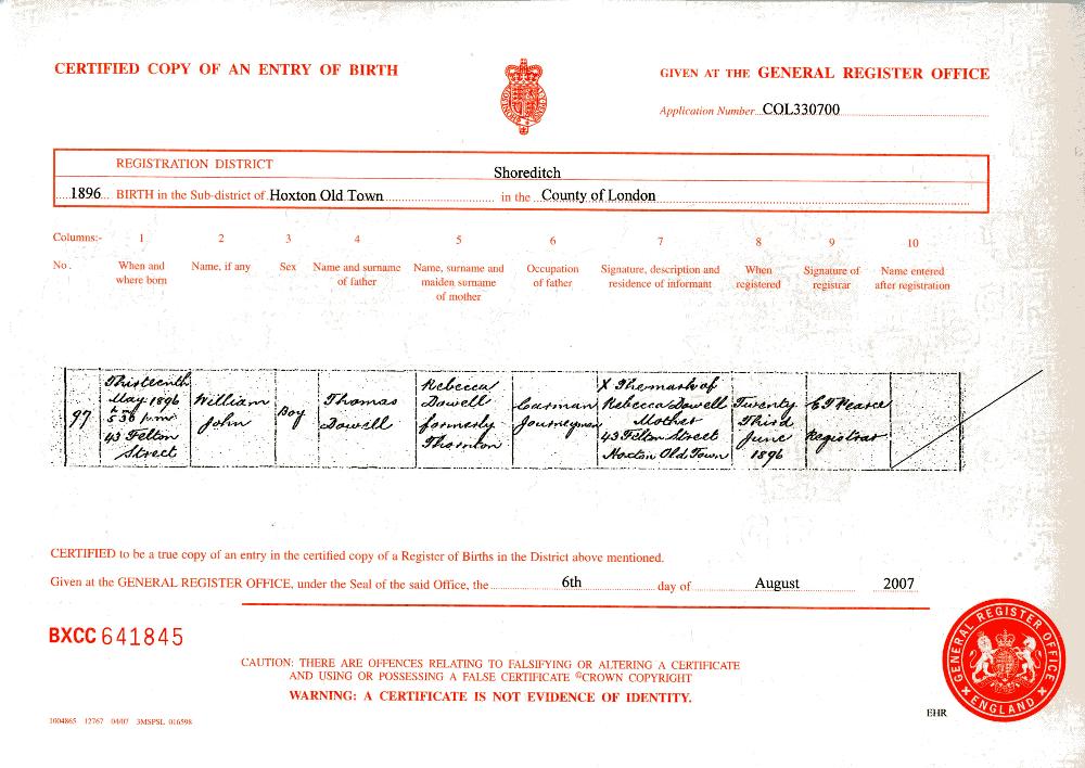 General Register Office, Certified Copy of an Entry of Birth for William John Dowell, (Issued on 6 August 2007 by General Register Office in response to Application No COL330700). Custom Id: BXCC 641845; Cit. Date: 13 May 1896. Jack Ward, The Nook, Silver Street
