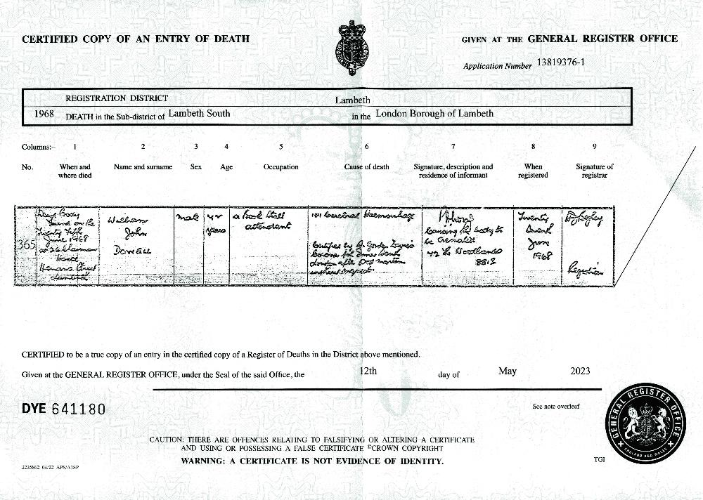 Death certificate of William John Dowell, 25 June 1968, Jack Ward.