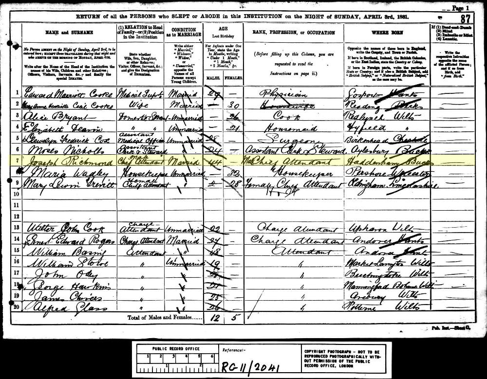 1881 England Census for Joseph Richmond in County Lunatic Asylum, Devizes St James, Wiltshire, (Ancestry image of National Archives RG11/2041; Folio 87; Page 1). Custom Id: RG11/2041; Folio 87; Page 1; Line 7; Registration District:Sub-DistrictDevizes St JamesWilts County Lunatic AsylumAddress:Devizes St JamesWilts County Lunatic AsylumAddress:Id NamesCondAge OccupationWhere Born158Joseph Richmond-Mar44 Male Chief AttendantHaddingham, Buckinghamshire. National Archives. Call Number: 1881 Census.