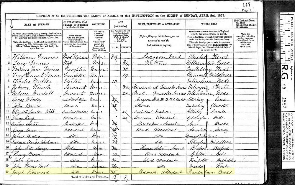 1871 England and Wales census, Stotfold, Bedforshire, The Three Counties Lunatic Asylum, RG10/1552; Folio 147; Page 1; Line 20, head of household: Joseph Richmond, National Archives.